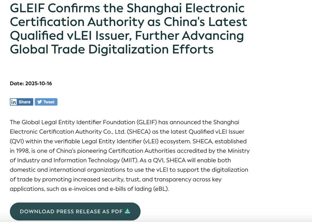 GLEIF Confirms the SHECA as China's Latest Qualified vLEI Issuer