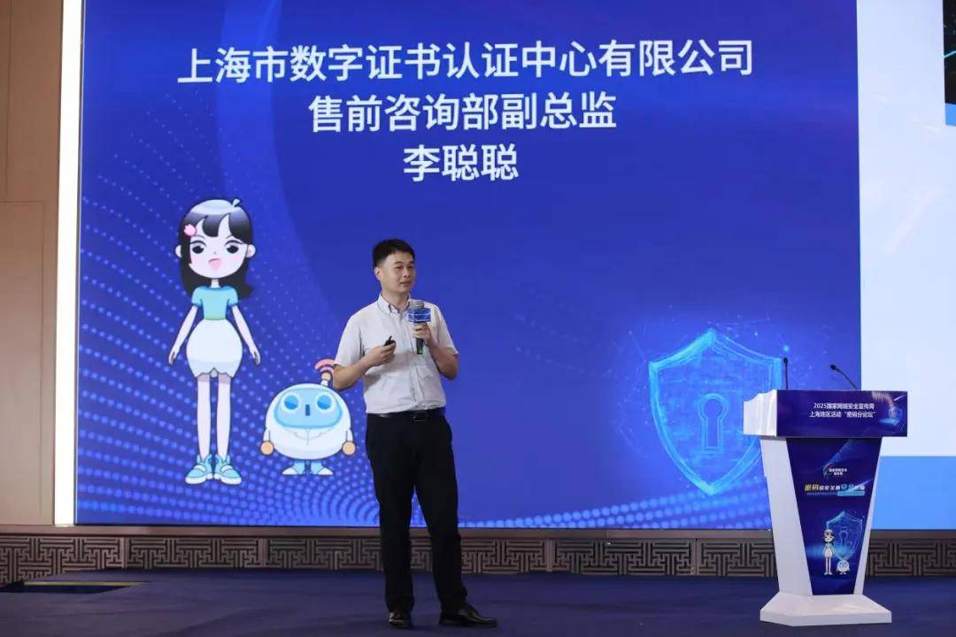 论坛主旨演讲环节,上海CA售前方案部副总监李聪聪做了题为“密码筑盾:上海CA全密态+芯密安全防护体系”的分享。