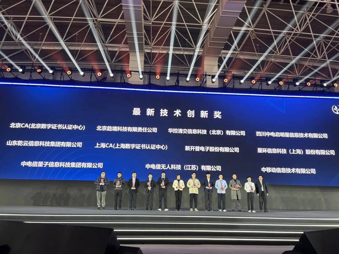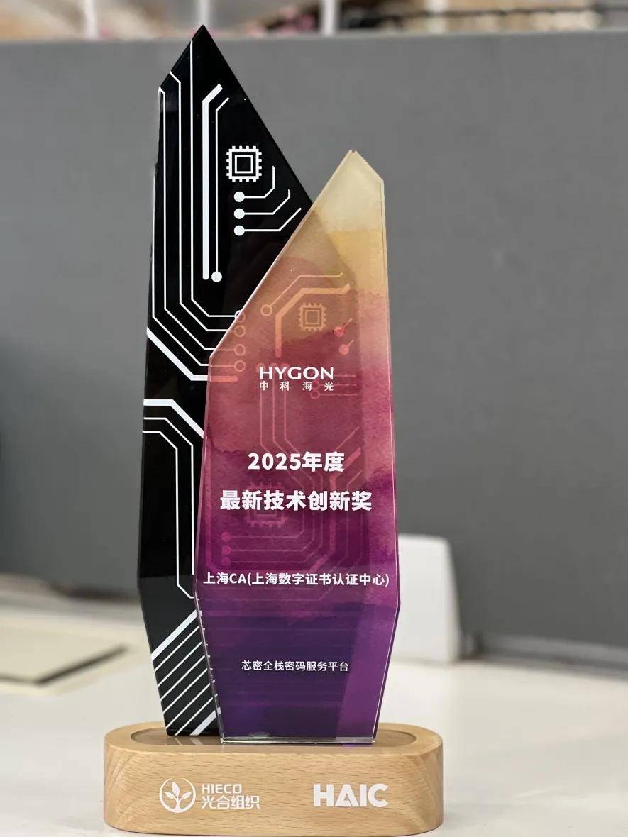 上海CA作为海光重要合作伙伴出席主论坛“2025光合组织生态共创大会”,在2025海光年度颁奖盛典环节,凭借上海CA芯密技术解决方案荣获最新技术创新奖。