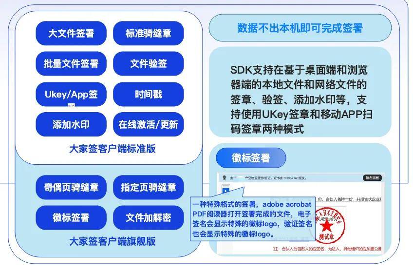 大家签可提供安装在用户本地设备的签章工具,包括大家签客户端标准版与大家签客户端旗舰版,支持使用上海CA签发的UKey(含法人一证通UKey)完成文件签章、验章和加解密,广泛应用于单机签署与招投标等场景,对于持有上海CA签发的UKey证书的用户十分友好。
