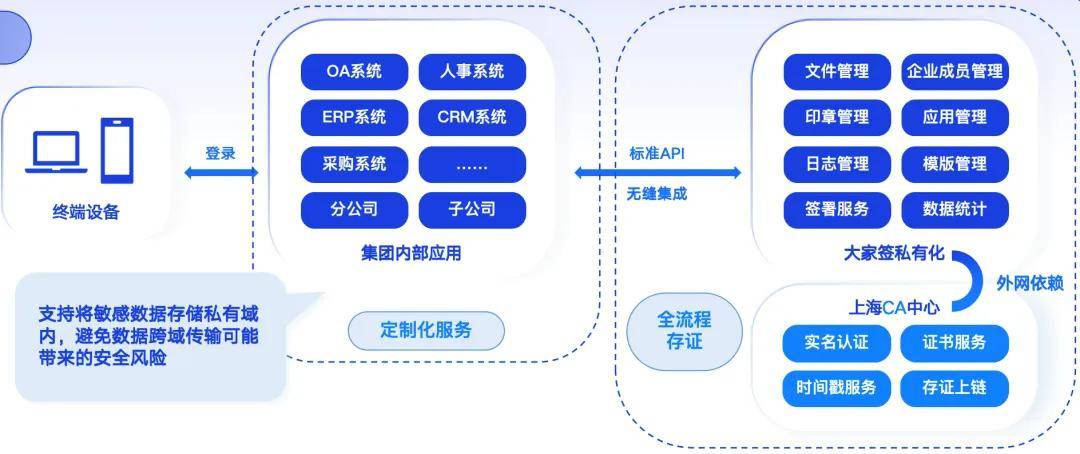 大家签提供本地部署的软件产品,另配套提供系统管理后台用于客户进行签章系统的运管服务。通过私有化部署,可实现全流程企业本地流转避免数据跨域传输可能带来的安全风险,同时可适配国内主流的国产化环境。因其具有强合规性、高安全性、高隐私性等特点,适合以下几类签署主体: