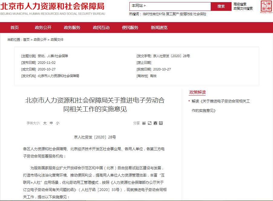 为服务国家服务业扩大开放综合示范区和中国(北京)自由贸易试验区建设与发展,打造市场化法治化营商环境、推动便民利企,提高用人单位人力资源管理效率,丰富“互联网+人社”应用场景,优化劳动用工管理模式,近日,北京市人力资源和社会保障局发布《关于推进电子劳动合同相关工作的实施意见》(以下简称《意见》),就推进电子劳动合同相关工作,提出实施意见。
