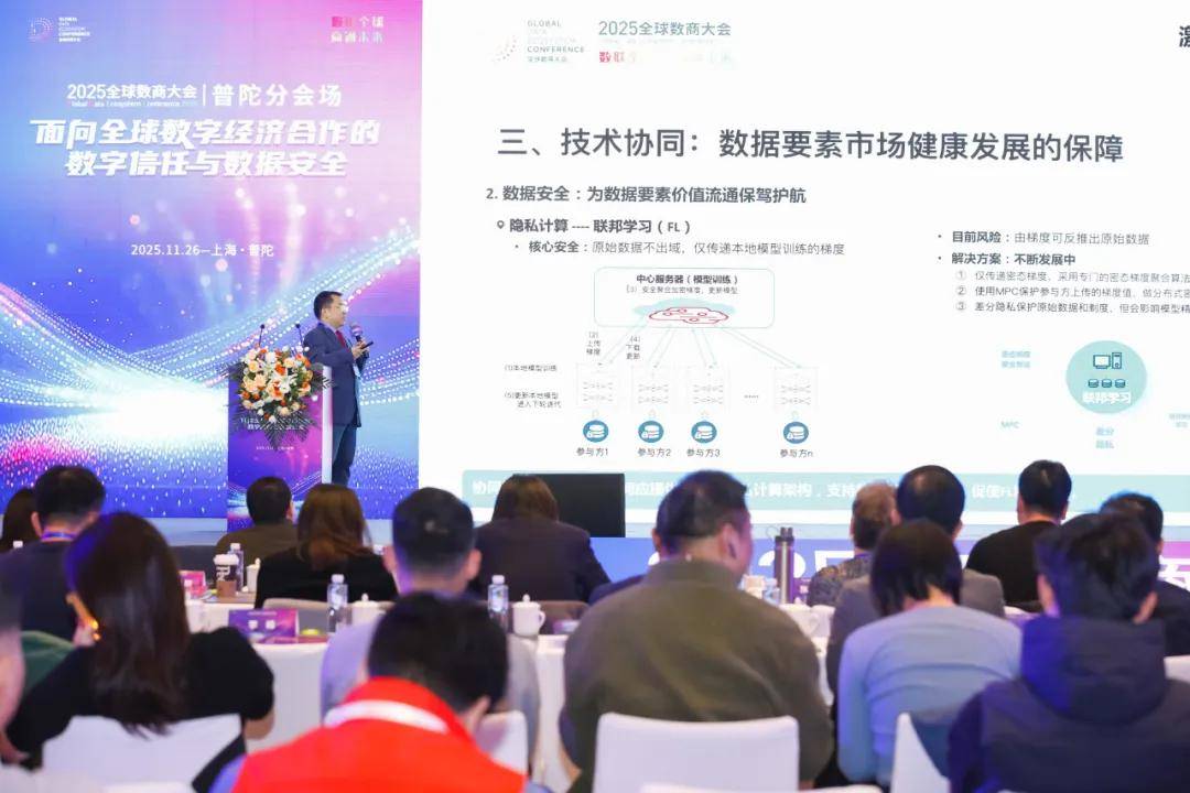 主旨演讲环节,上海CA首席密码专家包义保以“激活数据要素潜能:身份信任、数据安全与可信空间的协同共生”为题发表主旨演讲,系统解读政策赋能逻辑,结合数据要素市场顶层设计与技术导向要求,强调政策落地需依托技术创新构建合规支撑体系,聚焦技术协同维度,提出以身份信任为基础、数据安全为保障、可信空间为载体的技术协同框架,还结合上海数据集团与上海CA的实践参考方案,具象化呈现技术协同模式的落地成效。