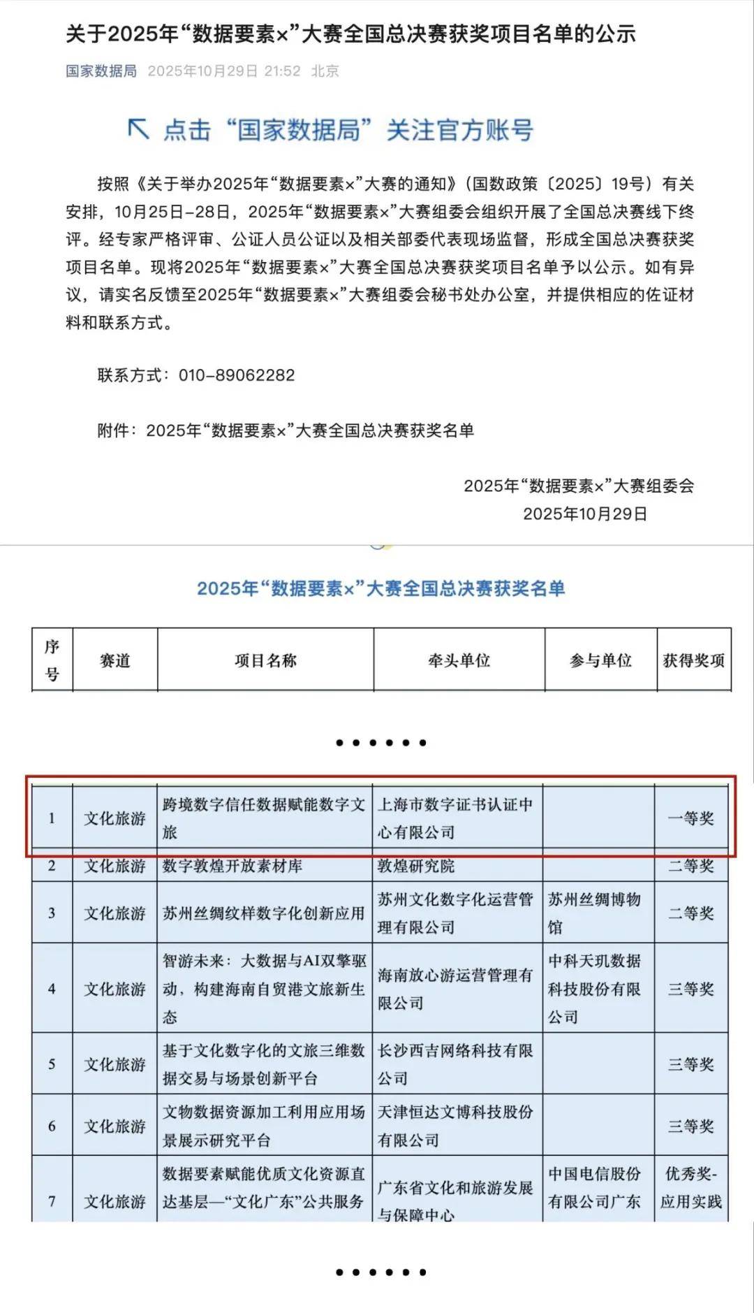 近日,国家数据局公示2025年“数据要素×”大赛全国总决赛获奖名单,上海市数字证书认证中心有限公司(以下简称“上海CA”)申报的“跨境数字信任 数据赋能数字文旅”项目凭借突出的技术创新力与实际应用价值,在文化旅游赛道脱颖而出,荣获全国总决赛一等奖。