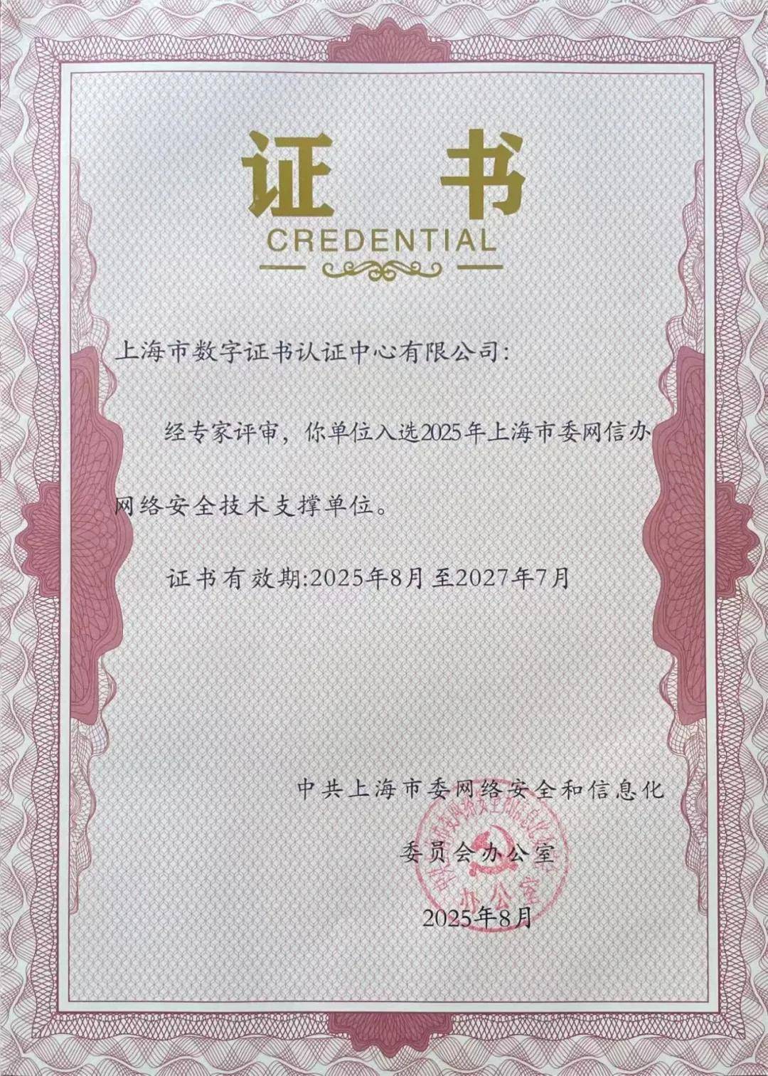 上海CA荣获市委网信办网络安全技术支撑单位认定