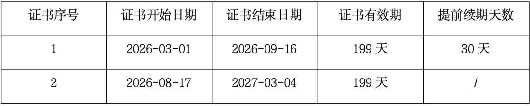 - 2026年3月1日后您仍可续期或新购以年为单位的证书订阅服务,但单张证书最大有效期为199天,您可以在第一张证书到期前的30天之内申请重签获取第二张证书,两张证书的有效期均为199天。